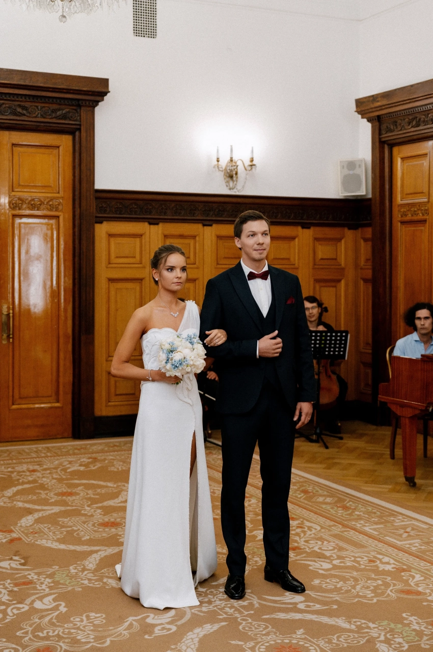 Сегодня в сети появились новые снимки со свадебной фотосессии и из ЗАГСа: фотосессия молодожёнов прошла в отеле "Балчуг Кемпински". На снимках невеста позирует в платье с разрезом бренда "Хохлома x Алёна Ахмадуллина" и в украшениях Mercury.