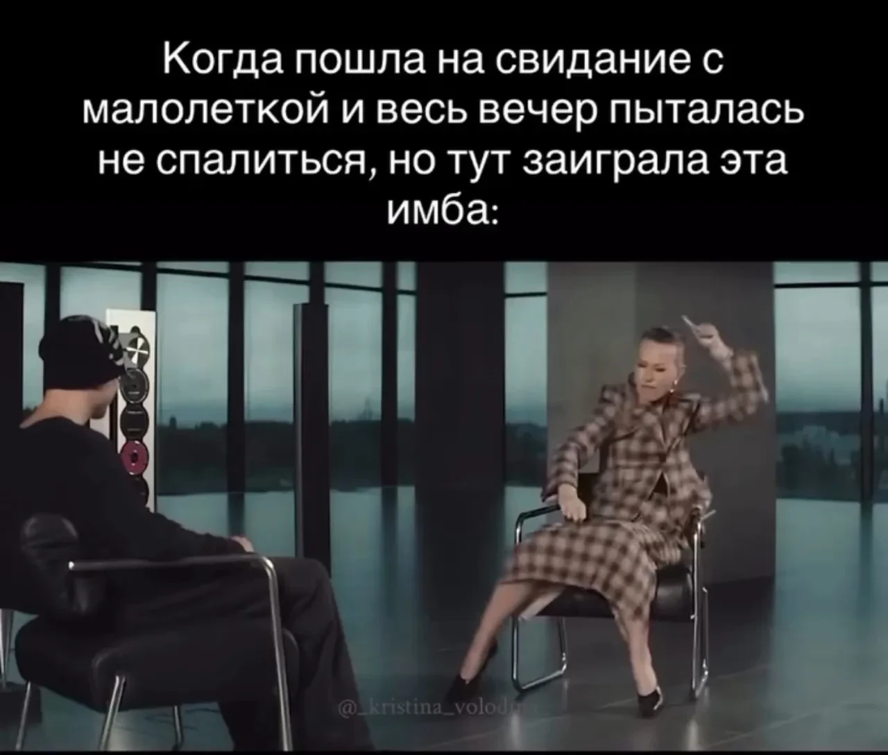 Во время интервью Ксения включила Славе песню Аллы Пугачёвой "Не обижай меня". Во время припева Собчак начала пританцовывать и двигать руками, в то время как сам Марлоу спокойно сидел на месте. Именно это и разошлось на мемы: большинство из них описывают разницу между поколениями и их восприятием чего-либо. В комментариях пользователи придумывают остроумные сравнения: "Бухгалтер на корпоративе", "Когда добавила водки в раф на лавандовом", "Та самая, которая кадрит молоденького".