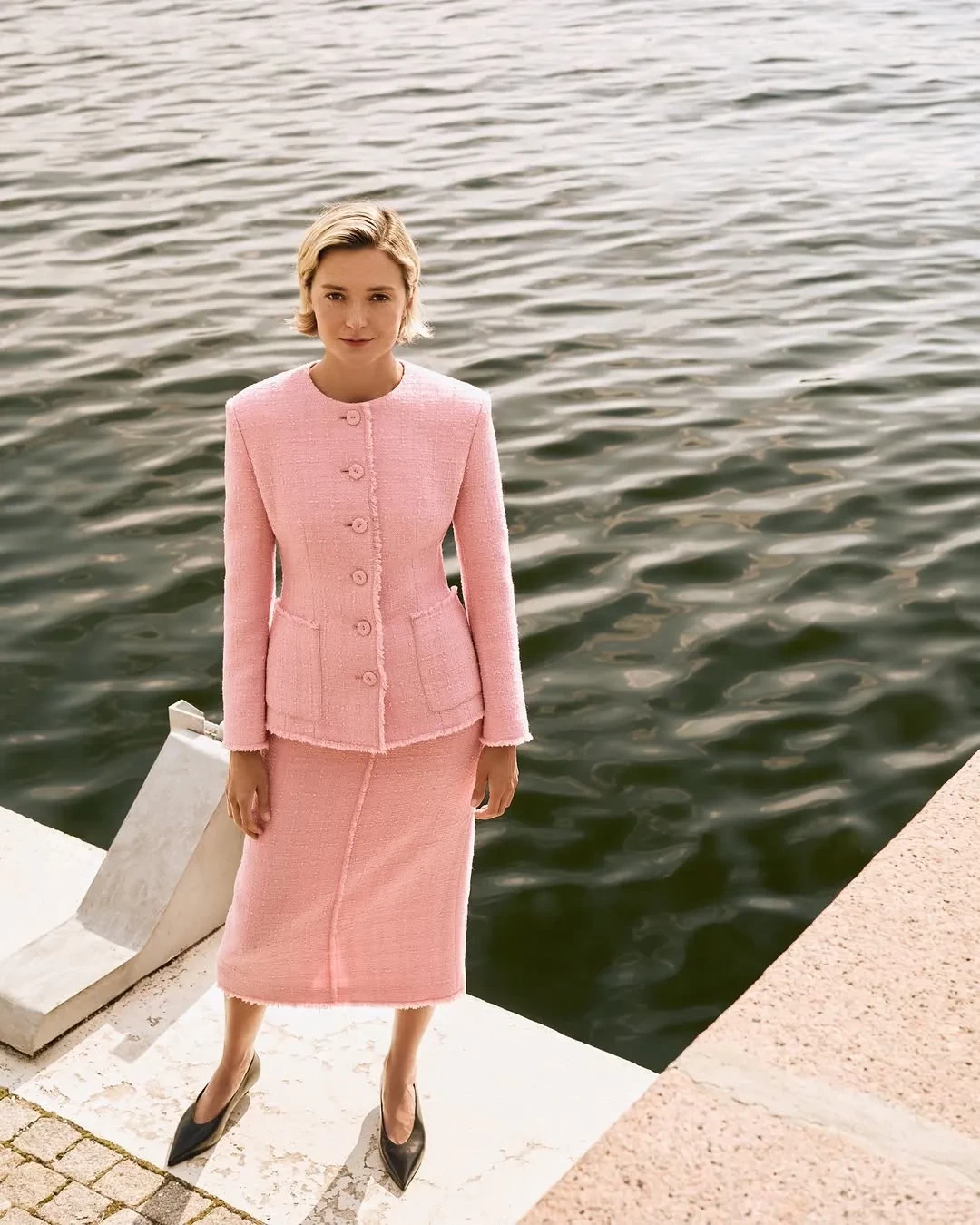 Для фотосессии Надежда примерила платье и юбку с георгинами, красное платье из шёлка, костюм из твида, шерстяное пальто и другие изделия из новой коллекции бренда.