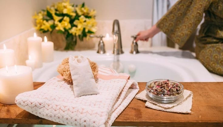 Наполните ванну тёплой водой, добавьте морскую соль, эфирные масла или травы.