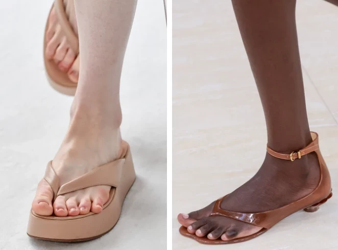 Главный фаворит — сандалии с перемычкой между пальцами. Минимализм? Возможно. Но скучными их точно не назовешь. В моде — ультратонкие модели в духе The Row и платформы без лишнего декора. А еще — гибриды вьетнамок и босоножек: на ремешке, с каблуком, с элементами гламура, но без перегруза. Лето обещает быть легким — и в прямом, и в стильном смысле.