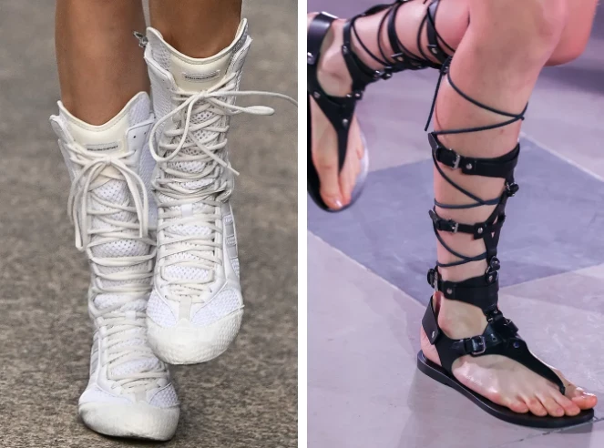 Сандалии-гладиаторы и высокие кроссовки снова с нами. Да, выглядят они смело — но в моде же главное не бояться. Боксерский стиль и отсылки к античности возвращаются медленно, но уверенно. Примерь — и, кто знает, может, именно эта пара станет твоей любимой.