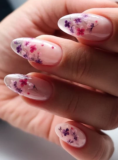 Преимущество — универсальность: прозрачная основа подходит к любому образу, а ногти визуально кажутся длиннее. Смелый акцент можно сделать с помощью ярких лепестков (например, оранжевых или розовых), а романтики добавят пастельные оттенки — лавандовый, голубой, нежно-розовый. Особенно эффектно смотрится техника с многослойным размещением цветов, создающая глубину.