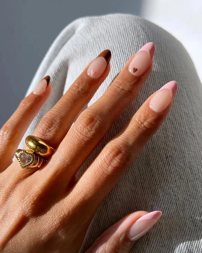 Кто бы мог подумать, что розовый и коричневый — идеальная пара? Этот френч поражает нежностью и оригинальностью. Смотрится необычно, но при этом очень утонченно. Идеально для романтических вечеров и прогулок по закатному городу.