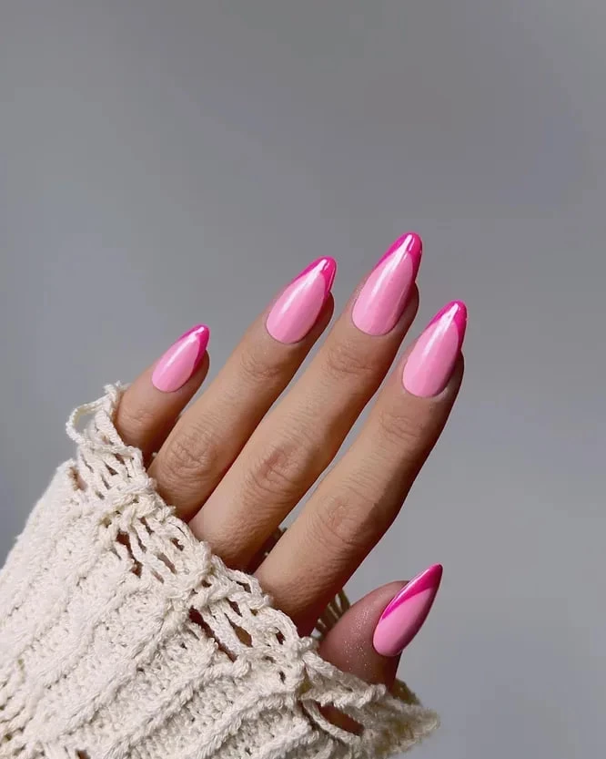Поклонницы розового ликуют — этим летом можно и нужно использовать разные его оттенки в одном маникюре. А хром придаст сияния и гламура. Такой френч точно привлечёт внимание и станет главным акцентом в образе.