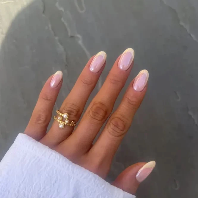 Маслянистый желтый цвет — яркий тренд лета 2025. Добавь его в свой френч и укрась легким хромированным блеском. Ногти будут напоминать теплые солнечные лучи, отраженные в стекле — стильно, свежо и очень по-летнему.
