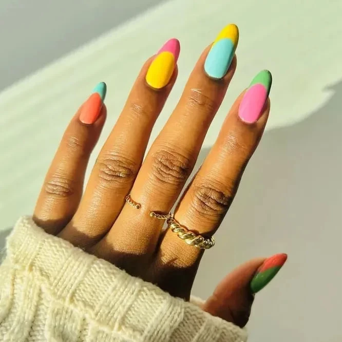 Если сложно выбрать один цвет — не нужно! Используй сразу несколько ярких оттенков на разных ногтях. Такой дизайн подходит тем, кто хочет выразить свою индивидуальность и игривое настроение.
