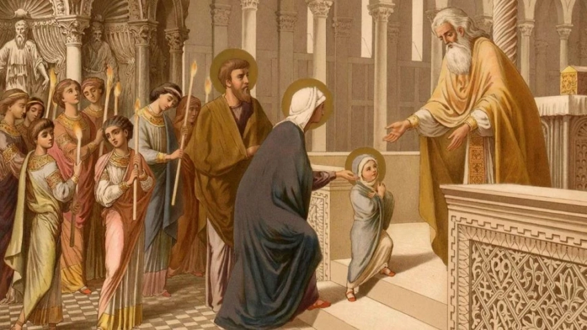Когда Марии исполнилось три года, ее родители, выполняя свое обещание, привели девочку в Иерусалимский храм. По преданию, первосвященник, ведомый Божественным вдохновением, провел ее в Святая Святых — место, доступное лишь раз в год. Здесь Мария провела свои детские и юношеские годы, посвящая себя молитве и духовным подвигам.