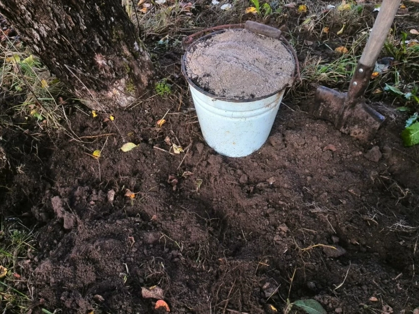 • Перегной или компост. Молодым деревьям до 3 лет достаточно 1–2 ведер, взрослым требуется не менее 4. Удобрение равномерно рассыпают в приствольном круге, слегка заделывают в почву граблями и обильно поливают.